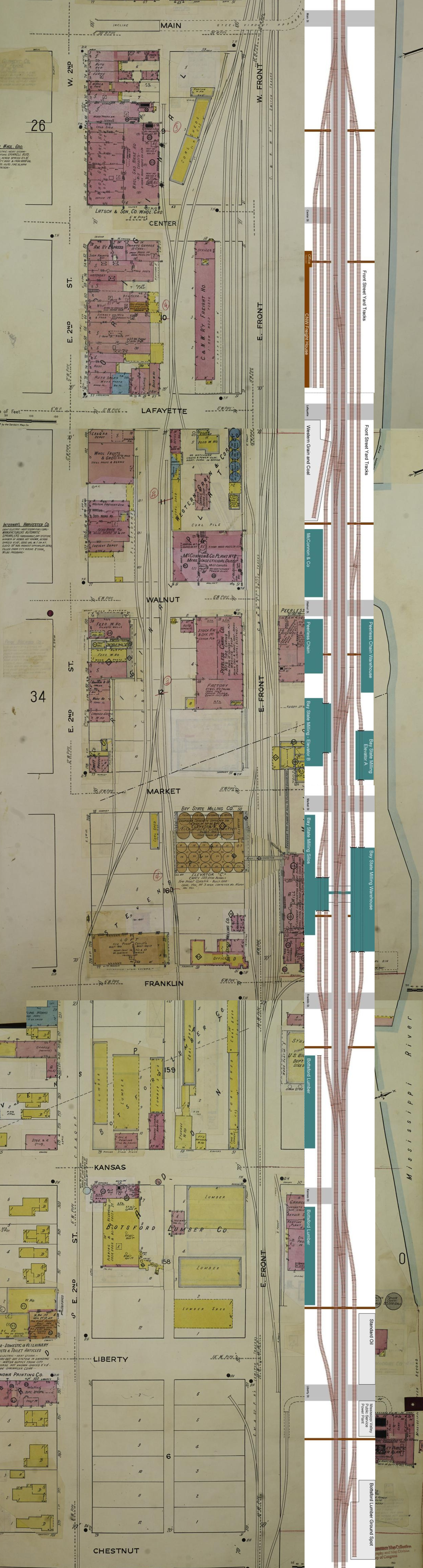 I based the track plan for the Chicago & North Western in Winona module set off of these Sanborn Maps from 1942. I have included them below so you can get an idea. I did my best to crop and size them and then overlaid the module plans on them. There is a bit of modelers license here to get the track to fit four foot modules, but the layout closely matches the number and alignment of tracks. I added a switch or two to enhance operations when only some of the modules are in use.