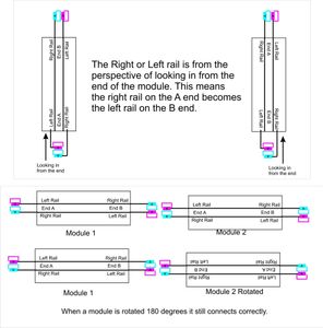 For builders coming from other club standards, having the wires reversed at each end sounds confusing. There have been a lot of questions about how this works. But rather than try to explain, click on the image to the right for a visual representation of how this reversing works. Image credit to Robert Sterner, HO Scale Free-mo modeler.