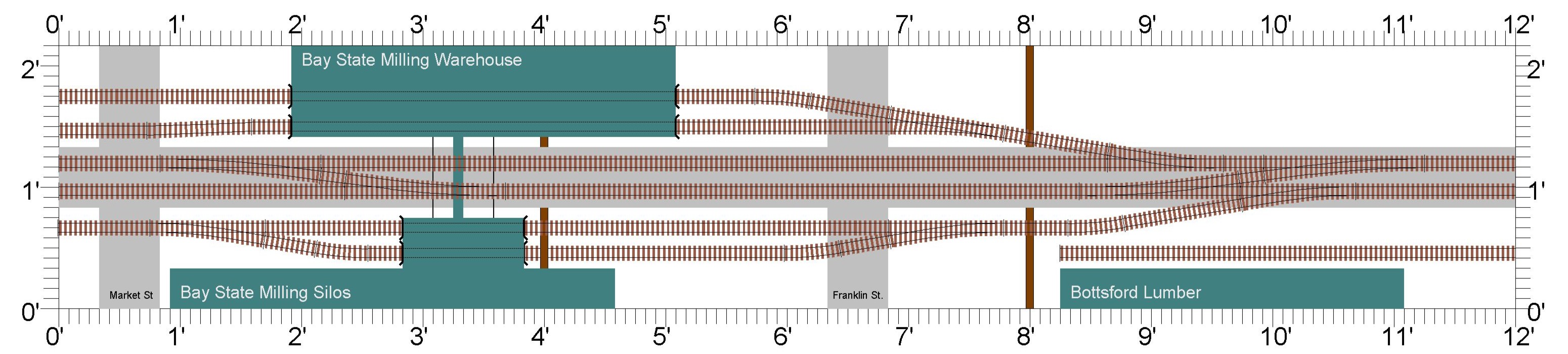 This module represents the Bay State Milling Company located on both sides of the CNW main line. There were large storage silos on the South side of the main and the Milling plant on the North, with an elevator between them. Bottsford Lumber had their coal and sand tracks just West of Kansas St. and will connect to the appropriate track on the Bottsford Lumber module.